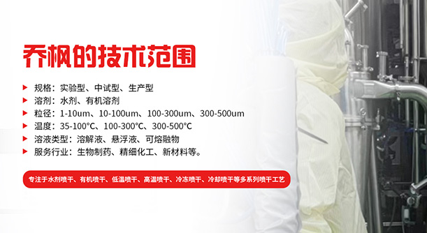 上海喬楓實業(yè)有限公司,成立于2012年,是從事噴霧干燥設(shè)備的研發(fā)設(shè)計、生產(chǎn)、銷售(小型噴霧干燥機(jī),實驗型噴霧干燥機(jī)35℃低溫噴霧干燥機(jī),有機(jī)溶劑噴霧干燥機(jī),低溫閉式循環(huán)噴霧干燥機(jī)超細(xì)粉末噴霧干燥機(jī)、噴霧冷凍干燥機(jī)、真空噴霧干燥機(jī)、氣流噴霧干燥機(jī)噴霧造粒干燥機(jī)離心噴霧干燥機(jī)沸騰制粒機(jī)等)和售后于一體的綜合性公司,本公司現(xiàn)成為一家致力于為生物制藥、精細(xì)化工、新能源、陶瓷造粒及食品工程等領(lǐng)域提供全套解決方案的整線交鑰匙工程企業(yè)。